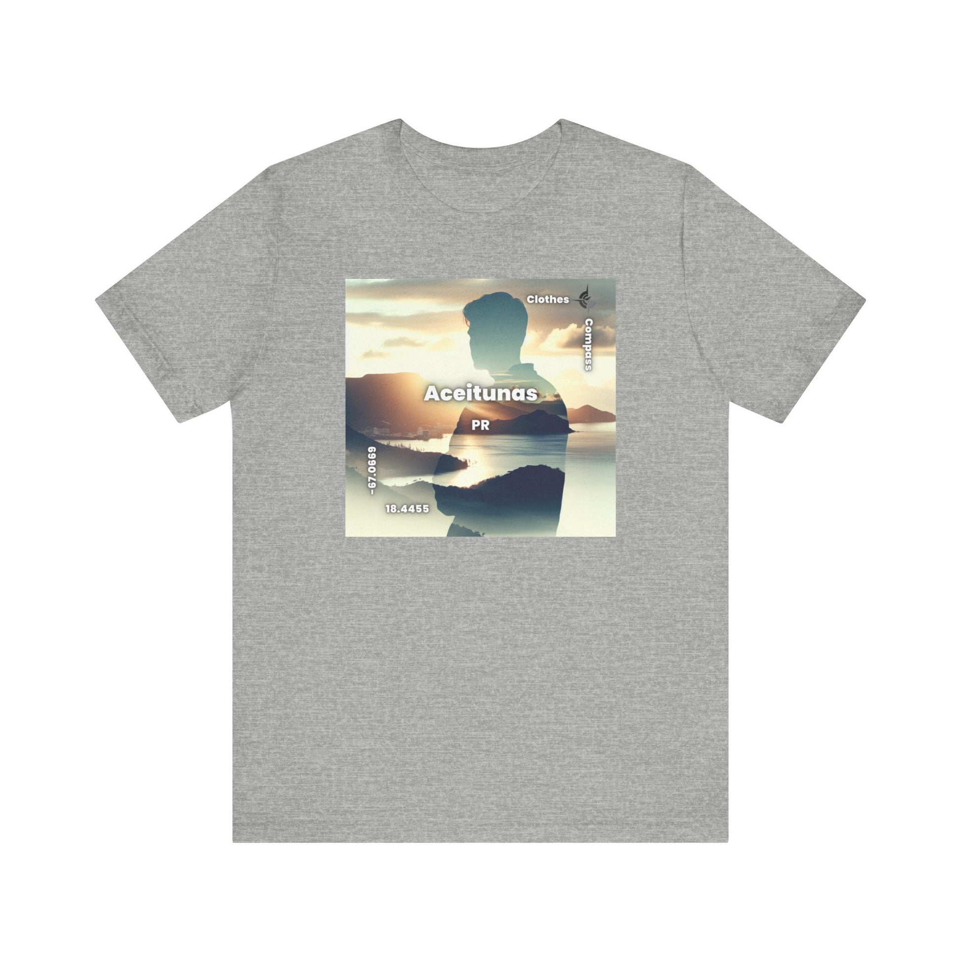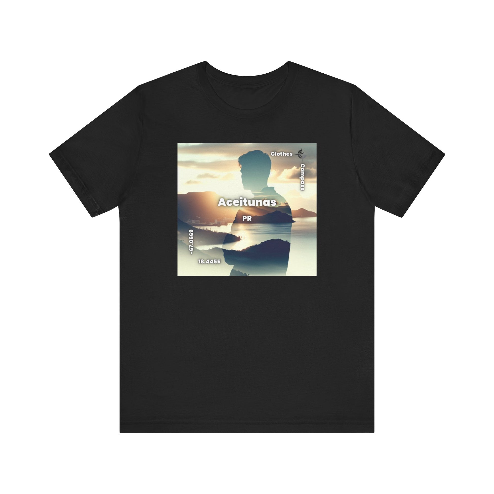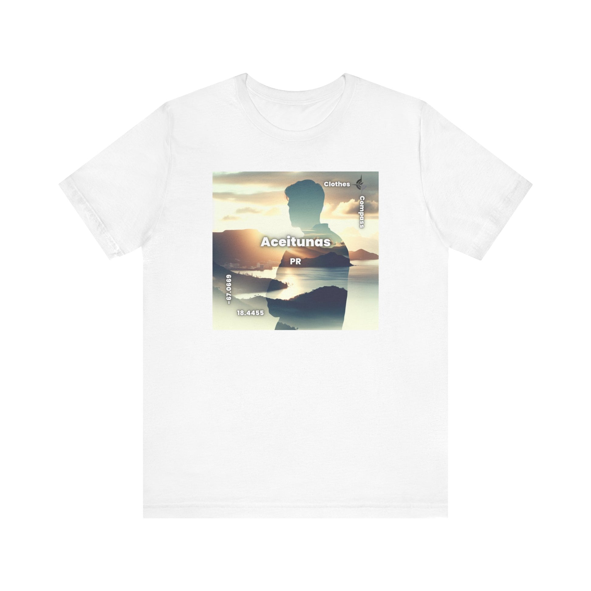 Introducing the ultimate streetwear tee: Aceitunas PR. This tee features a stunning double exposure of a person's silhouette and a clear day view of the beautiful Aceitunas landscape. The photorealistic design and calming mood make this tee