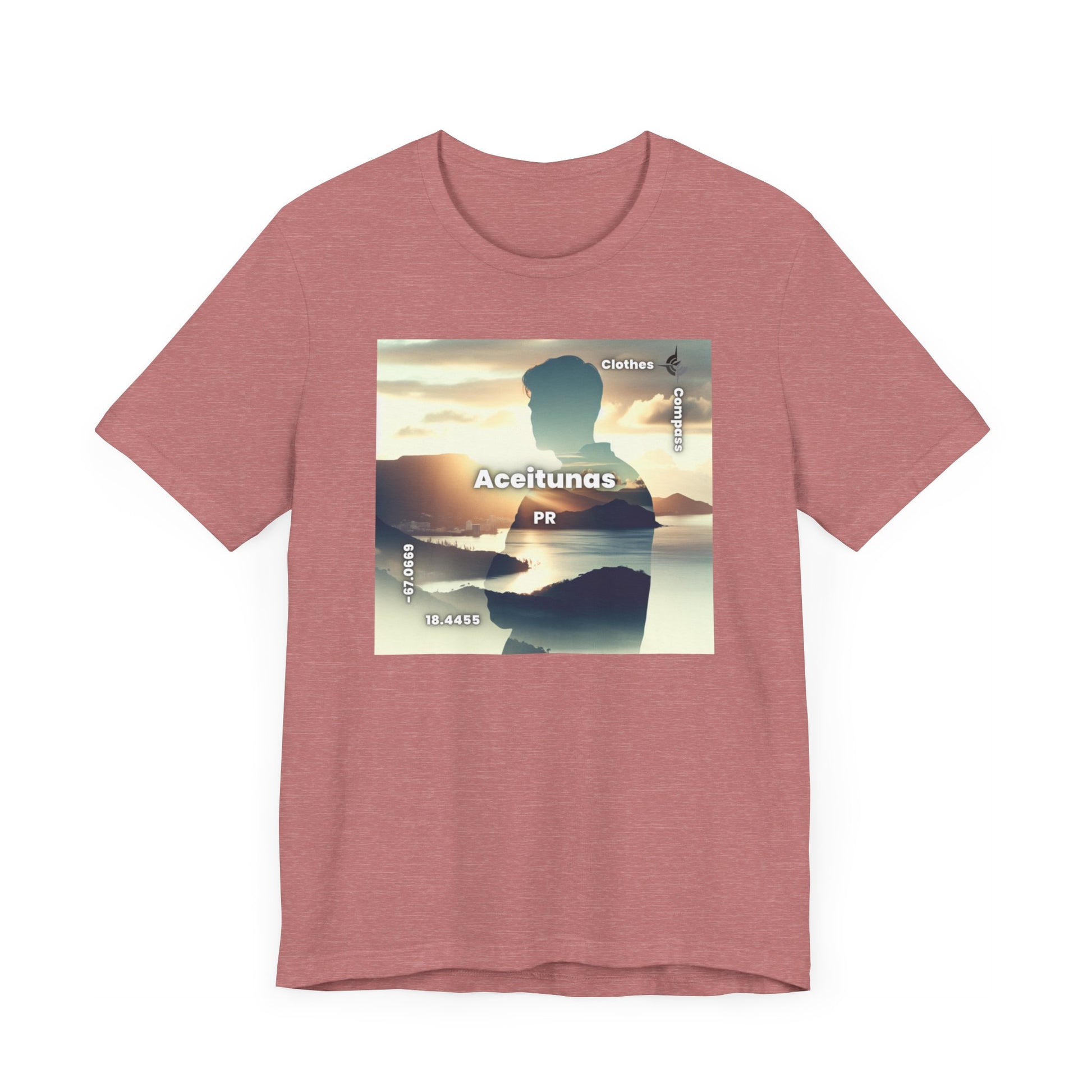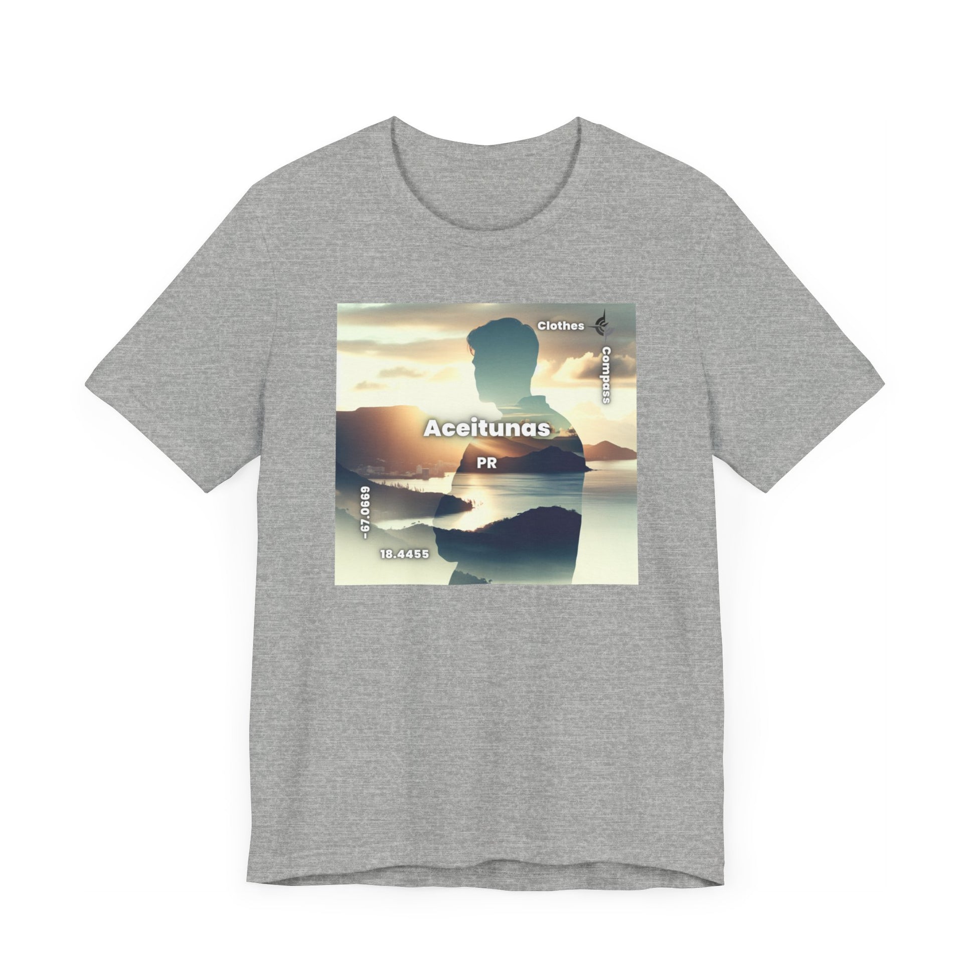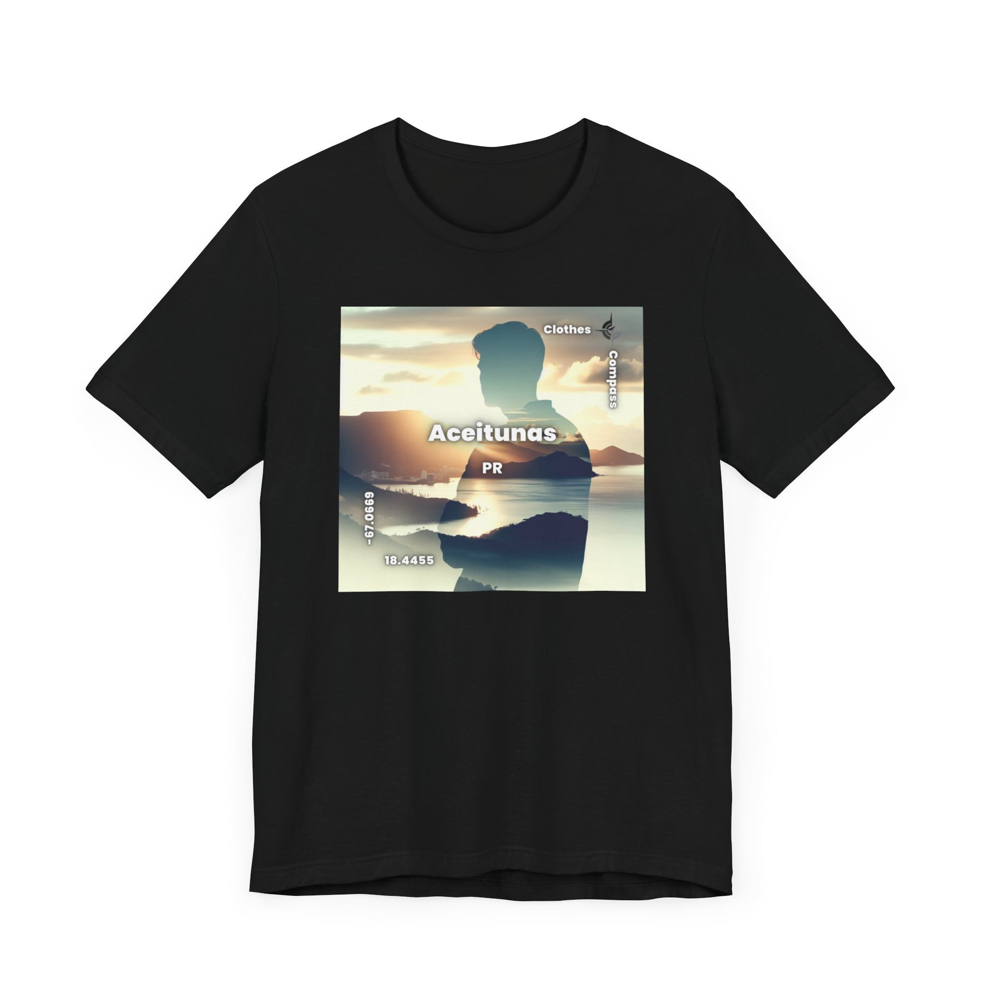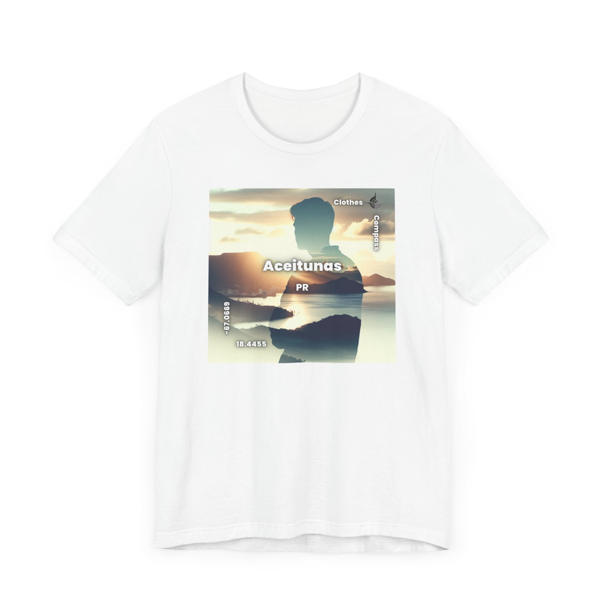 Introducing the ultimate streetwear tee: Aceitunas PR. This tee features a stunning double exposure of a person's silhouette and a clear day view of the beautiful Aceitunas landscape. The photorealistic design and calming mood make this tee