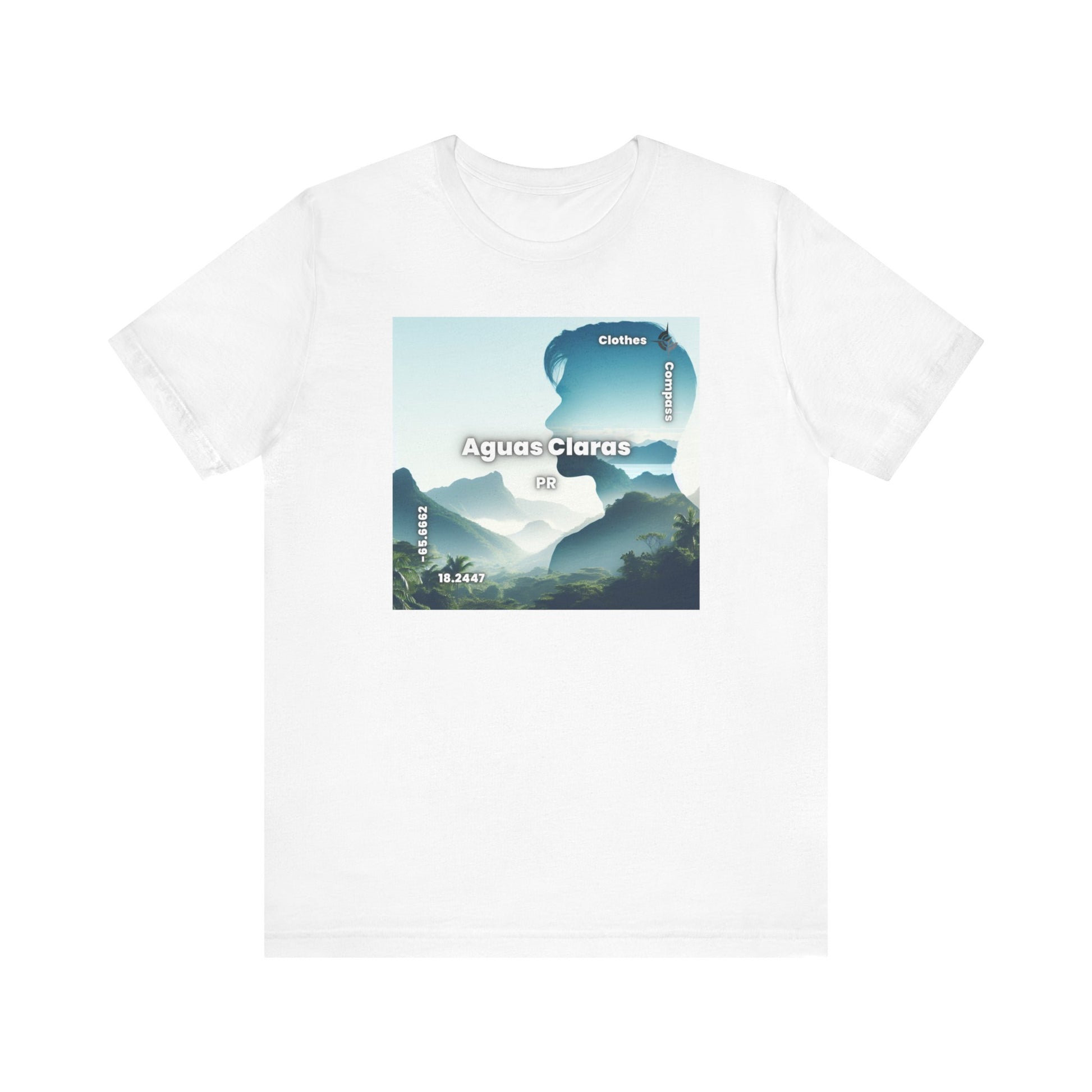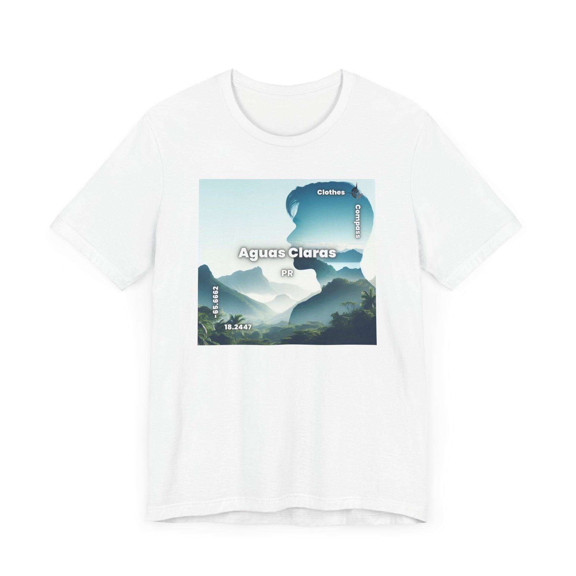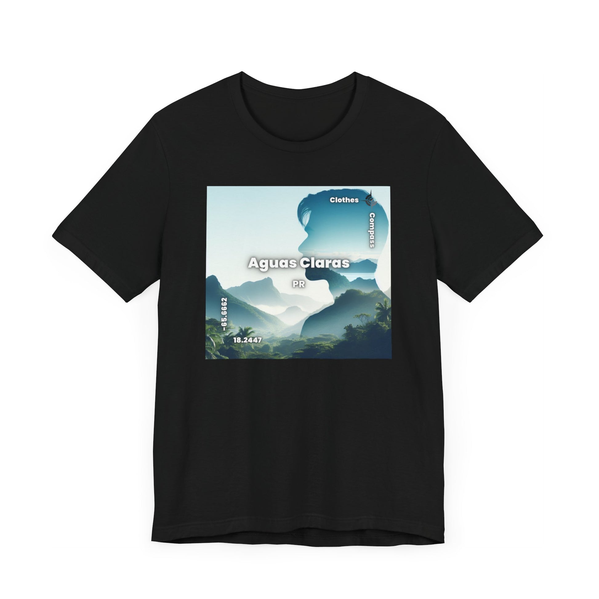 Introducing our new streetwear t-shirt, featuring a stunning double exposure design of a person's silhouette and a clear day view of Aguas Claras, PR landscape. The photorealistic design evokes a calming mood, making it a