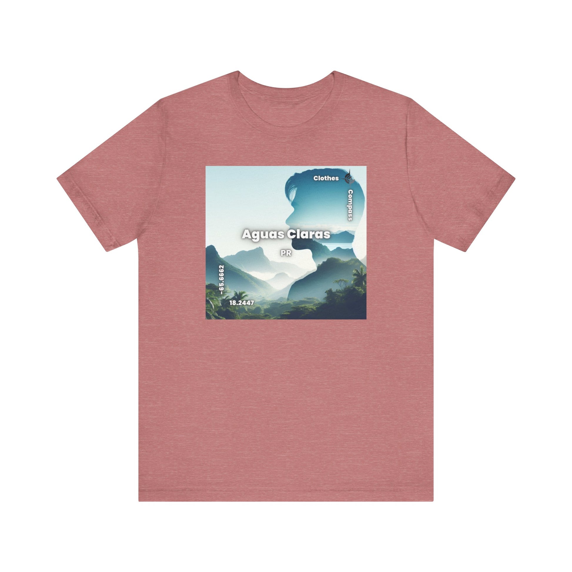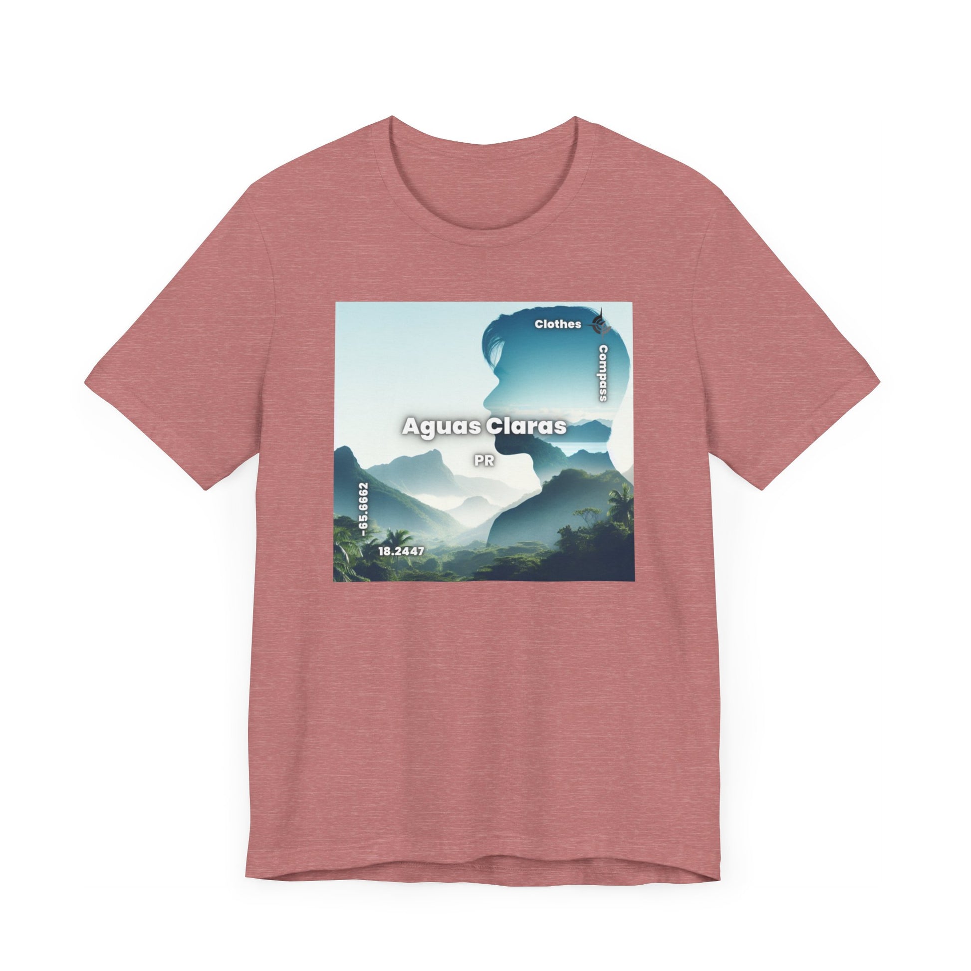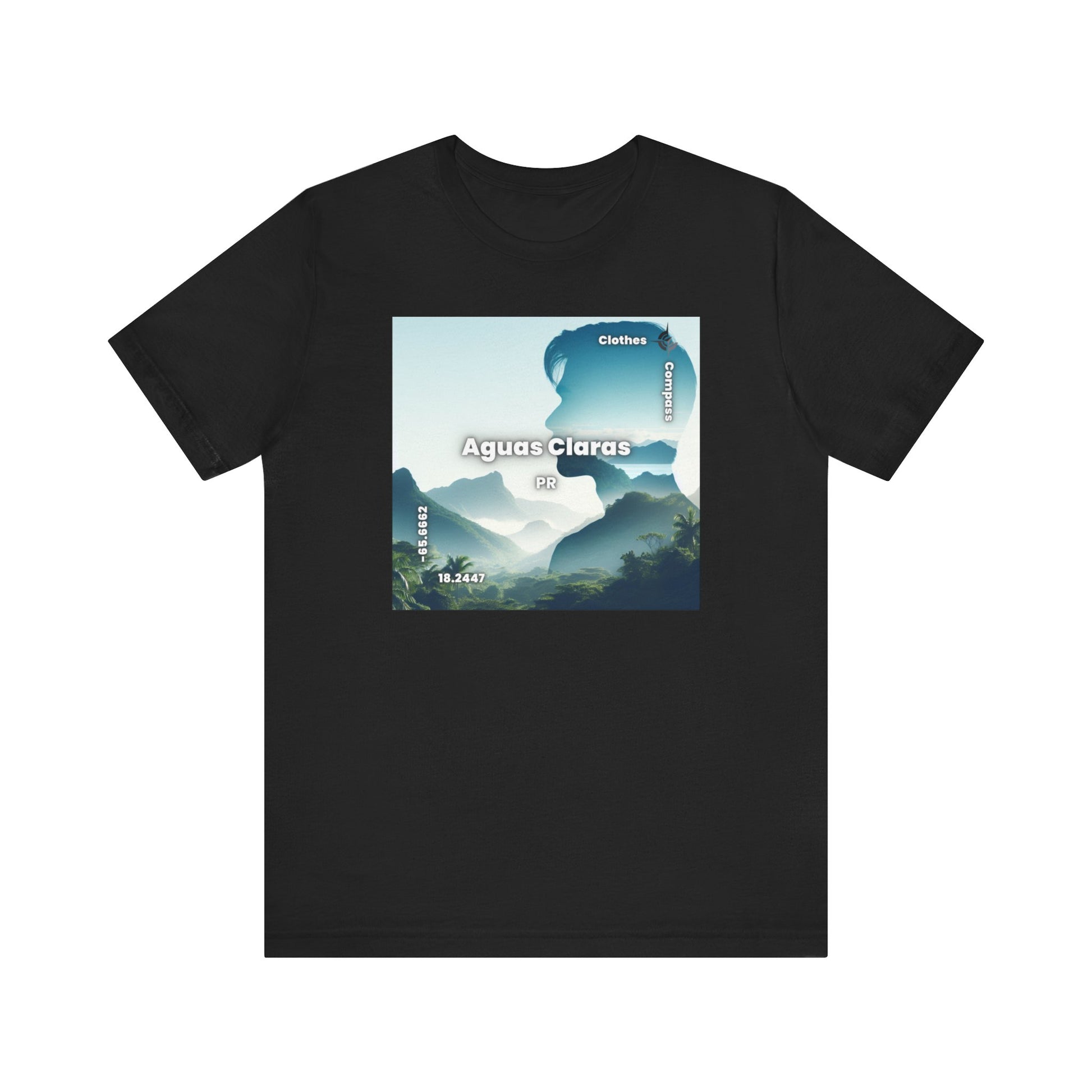 Introducing our new streetwear t-shirt, featuring a stunning double exposure design of a person's silhouette and a clear day view of Aguas Claras, PR landscape. The photorealistic design evokes a calming mood, making it a