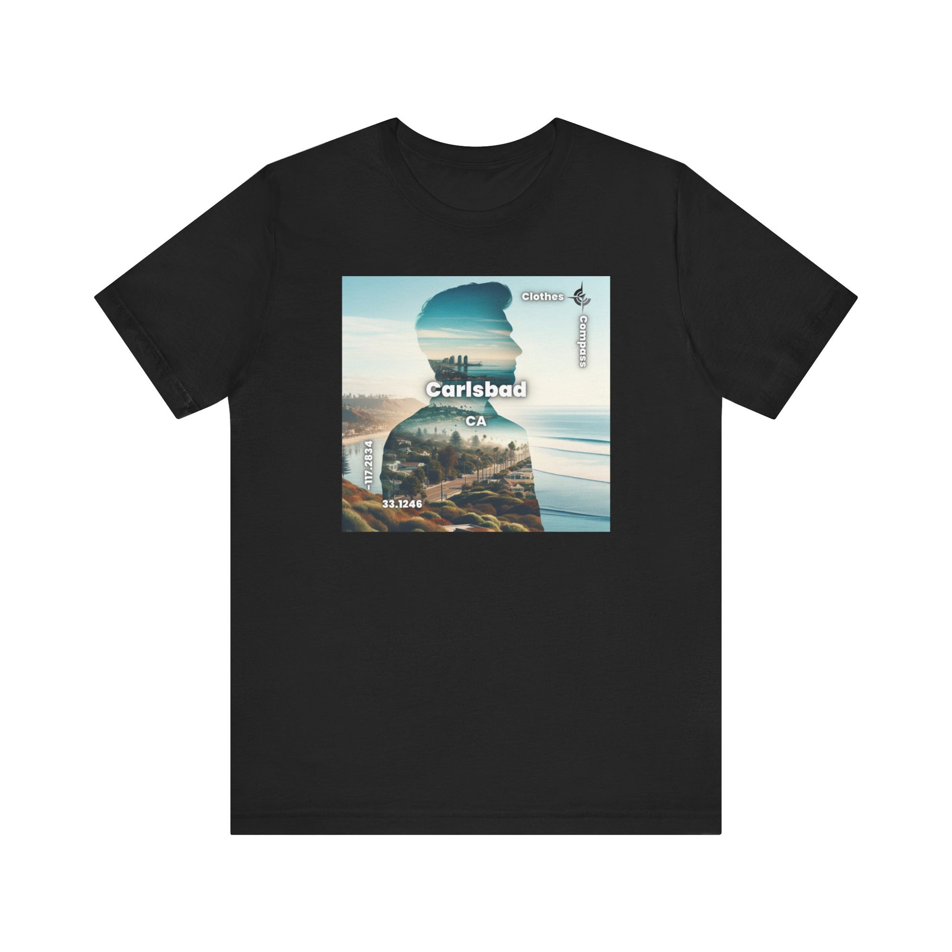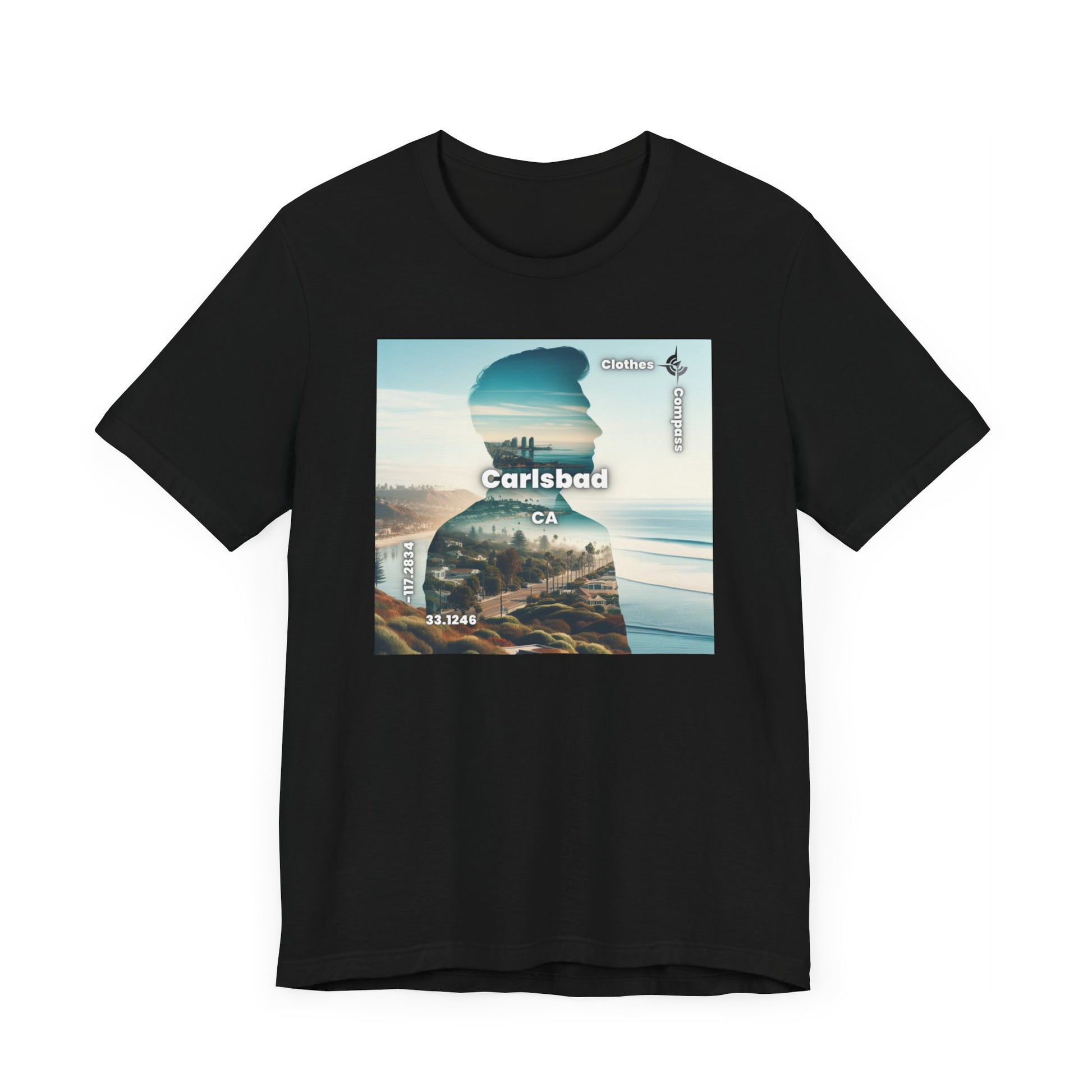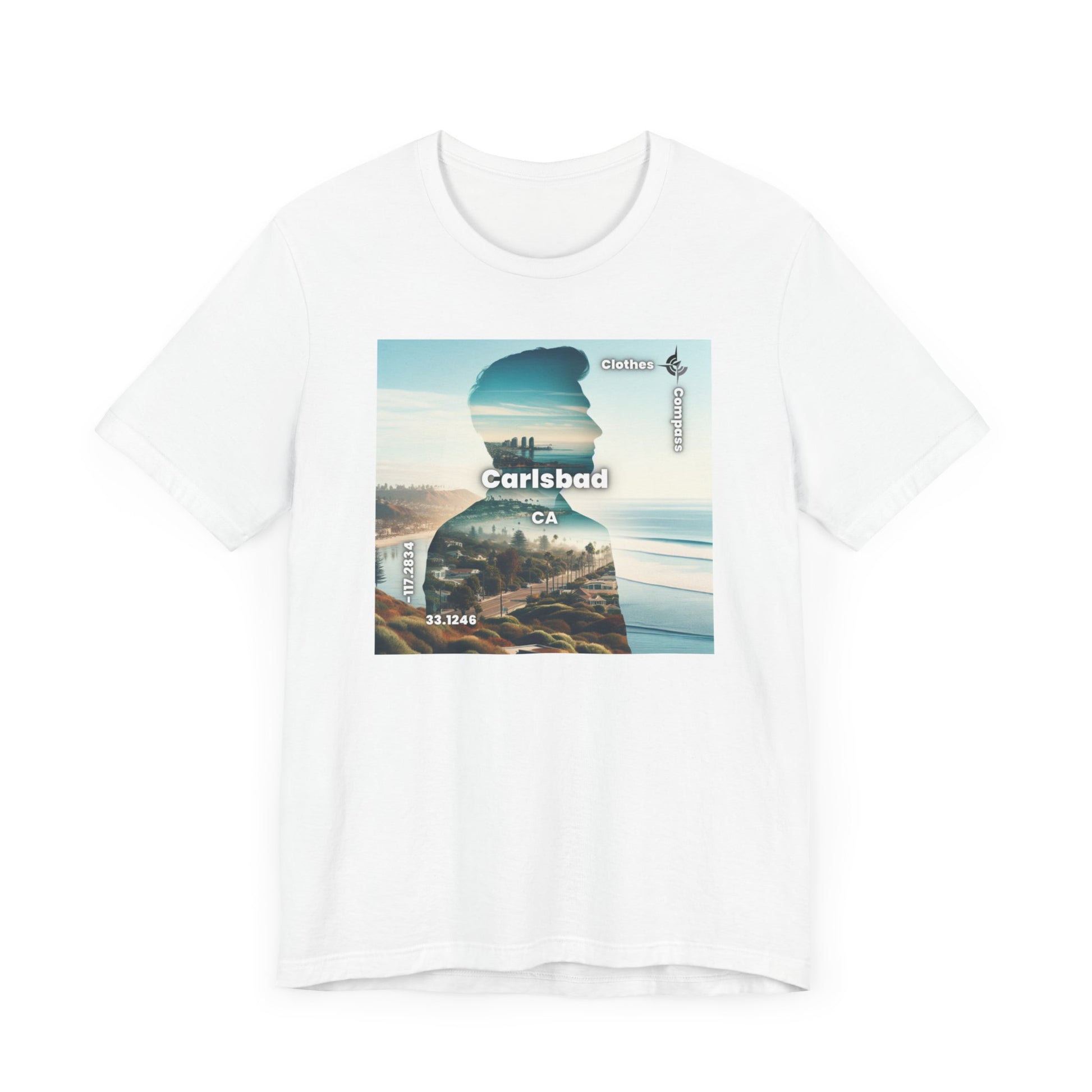 Introducing our latest streetwear tee, featuring a stunning double exposure of a person's silhouette against the clear day view of Carlsbad, CA landscape. The photorealistic design creates a calming mood for the perfect casual look. #Carls