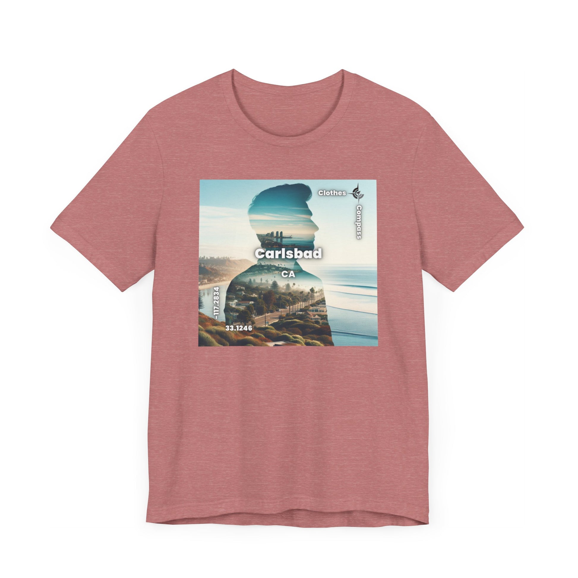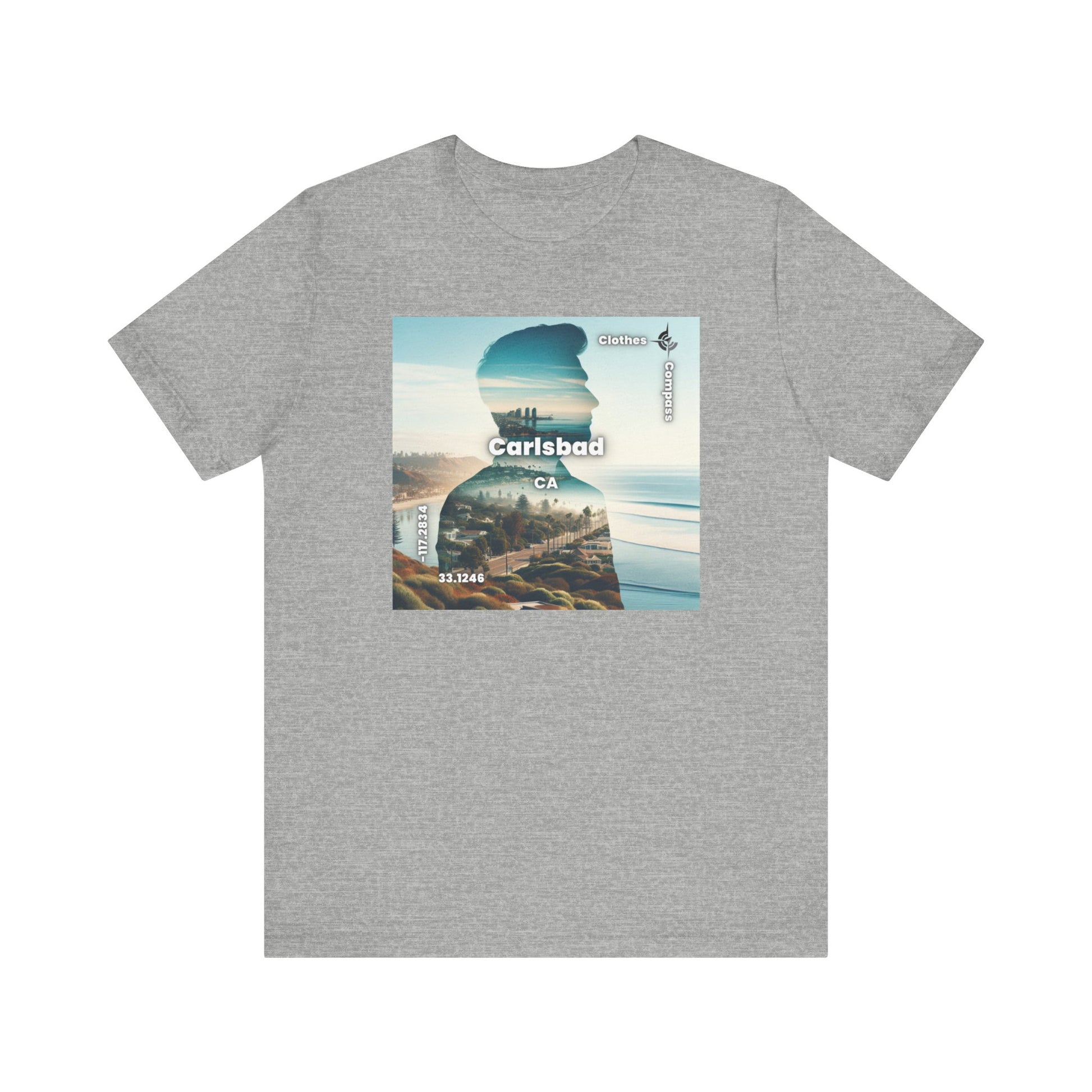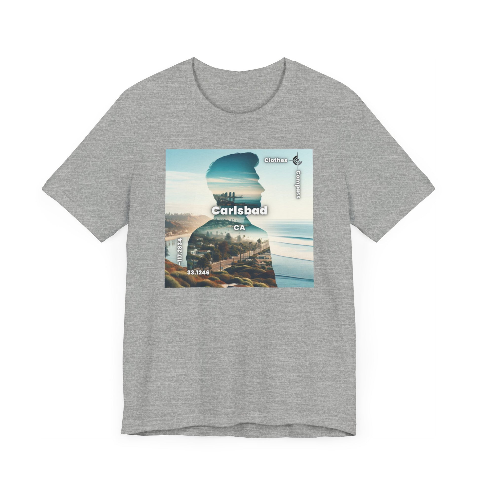 Introducing our latest streetwear tee, featuring a stunning double exposure of a person's silhouette against the clear day view of Carlsbad, CA landscape. The photorealistic design creates a calming mood for the perfect casual look. #Carls